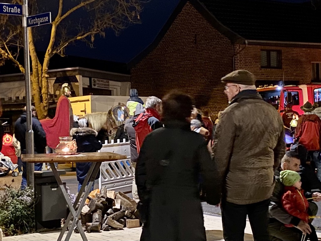Pünktlich um 18 Uhr setzte sich der ansehnliche Zug bunter Laternen und leuchtender Kinderaugen in Bewegung durch die von den Anwohnern stimmungsvoll mit Laternen und Kerzen geschmückten Dorfstraßen. Vorweg der Dorfbewohner Jürgen Esser, als Sankt Martin in schmucker römischer Offiziersuniform, getragen von der Haflingerstute Erika, begleitet von der Freiwilligen Feuerwehr und dem Tambourkorps „Echo“ Niederdrees.