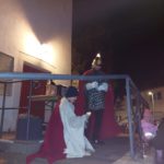 Der beeindruckend lange Zug endete schließlich am Martinsfeuer auf dem nagelneuen Dorfplatz vor der Antoniuskirche, auf deren Treppenaufgang wieder das traditionelle Martinsspiel aufgeführt wurde, in dem Sankt Martin seinen Mantel mit einem auf den Stufen liegenden Bettler, dargestellt von Antonia Esser, teilt.
